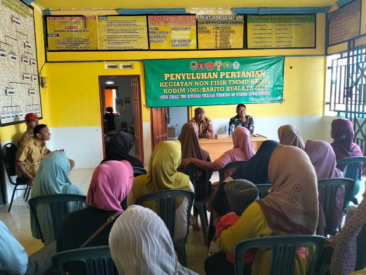 BARITO KUALA – Kodim 1005/Barito Kuala kembali menunjukkan komitmennya dalam mendukung pembangunan daerah melalui kegiatan Non Fisik TNI Manunggal Membangun Desa (TMMD) ke-126. Pada Senin (13/10) kemarin, bertempat di Balai Desa Tumih, Kecamatan Wanaraya, Kodim 1005 menggelar penyuluhan pertanian yang dihadiri oleh sekitar 50 warga setempat.