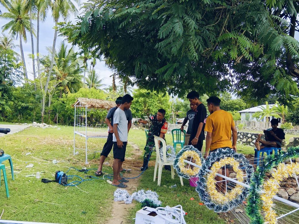 Dalam rangka menyambut perayaan Hari Raya Natal, Babinsa Desa Rainawe dari Koramil 1605-5/Kobalima, Serka Servandus Bou, berkolaborasi dengan para Orang Muda Katolik (OMK) Stasi Namfalus untuk membuat pohon Natal dan kandang Natal. Kegiatan ini berlangsung pada Rabu, 24 Desember 2025, di halaman Gereja Stasi Namfalus yang terletak di Dusun Namfalus, Kecamatan Kobalima, Kabupaten Malaka.