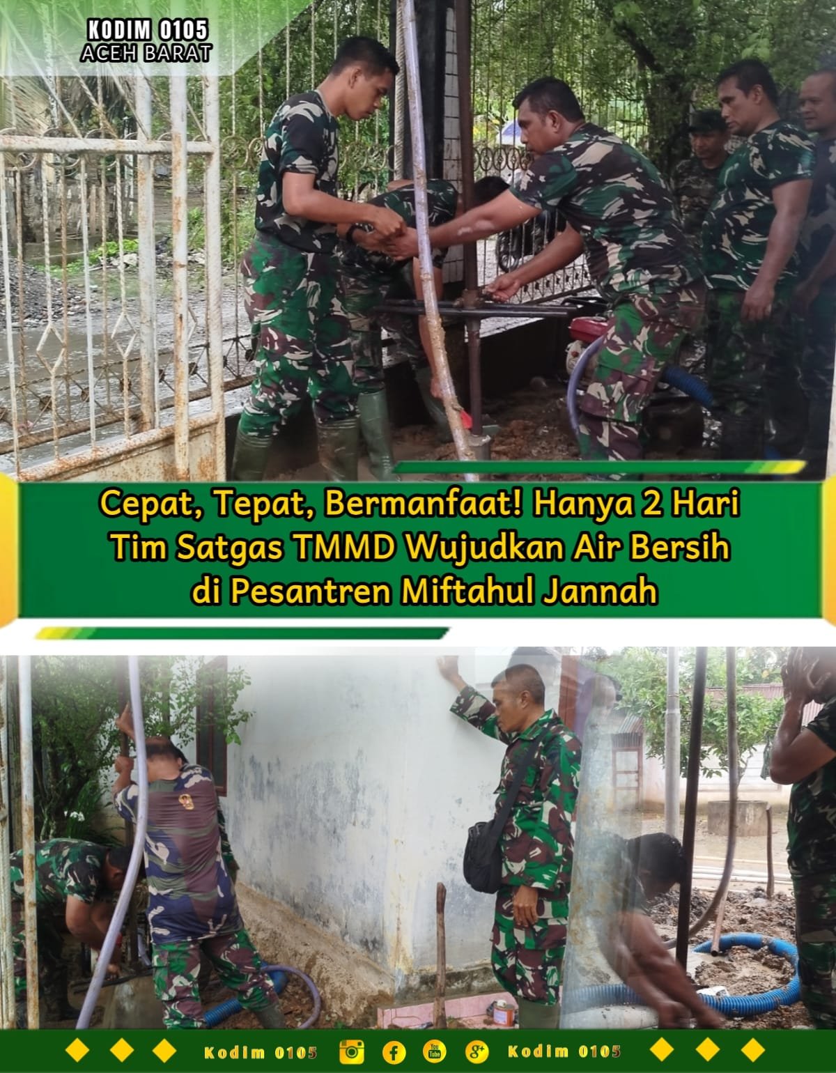 ACEH BARAT – Kesulitan air bersih yang selama ini membayangi aktivitas Pesantren Miftahul Jannah di Desa Lueng Jawa, Kecamatan Woyla, kini tinggal kenangan. Dalam dua hari, Satgas TMMD Reguler ke-127 Kodim 0105/Abar menghadirkan solusi nyata melalui pembangunan sumur bor, Senin (23/2/2026).