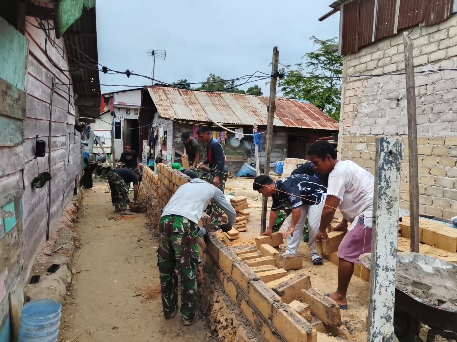 Kendari – Keceriaan tampak jelas di wajah Ibu Momi saat menyaksikan rumahnya yang dulunya sederhana kini mulai berdiri lebih kokoh berkat program Rutilahu TMMD ke-127 yang dilaksanakan oleh Kodim 1417/Kendari di Kelurahan Petoaha, pada Sabtu (21/2). Anggota Satgas dan warga lokal bekerja sama untuk melanjutkan pemasangan dinding batako, yang merupakan bagian penting dalam proses rehabilitasi rumah. Pekerjaan ini menjadi fondasi utama untuk menciptakan hunian yang lebih aman dan sehat bagi keluarga penerima manfaat.