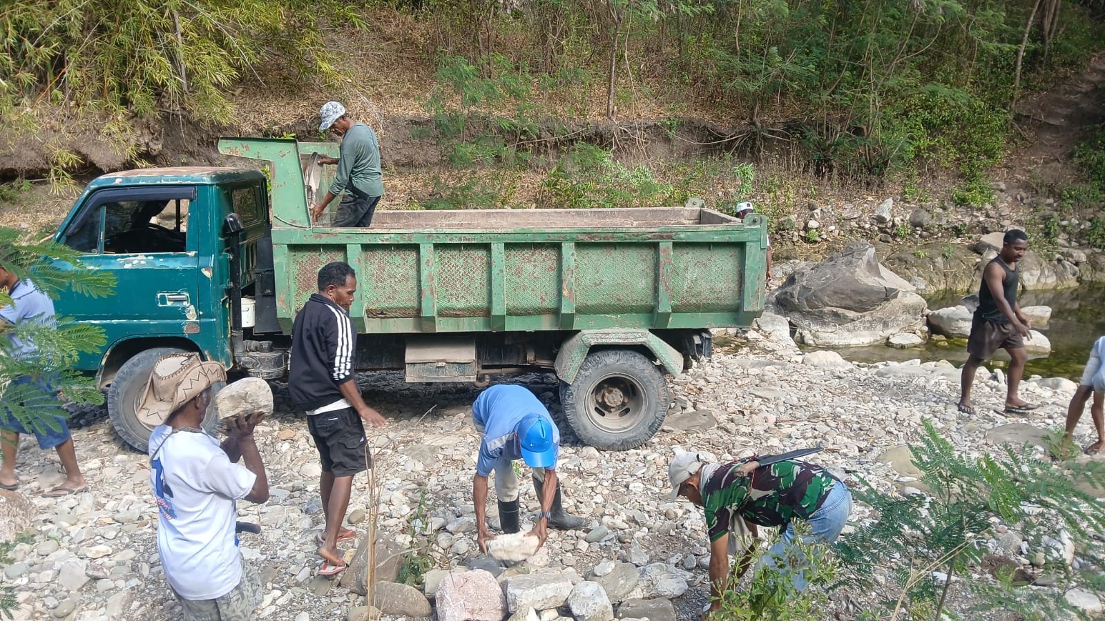 NAEKASA, KODIM 1605/BELU – Semangat gotong royong kembali terlihat kuat dalam pelaksanaan TMMD ke-125 Kodim 1605/Belu di Desa Naekasa, Kecamatan Tasifeto Barat, Kabupaten Belu. Masyarakat setempat secara sukarela turut menyuplai material batu kali dari sungai untuk mendukung pembangunan jalan yang menjadi salah satu sasaran fisik dalam program ini.