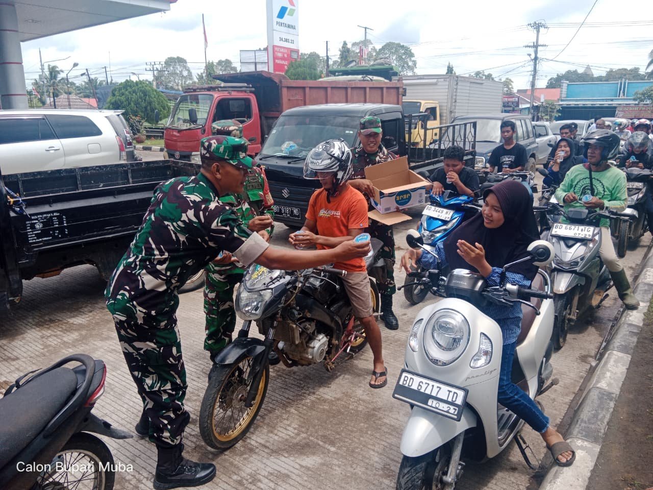 Kodim 0428/MukoMuko yang hadir berbagi minuman gratis untuk warga yang antri BBM di sejumlah SPBU di Kelurahan Bandar Ratu MukoMuko.
