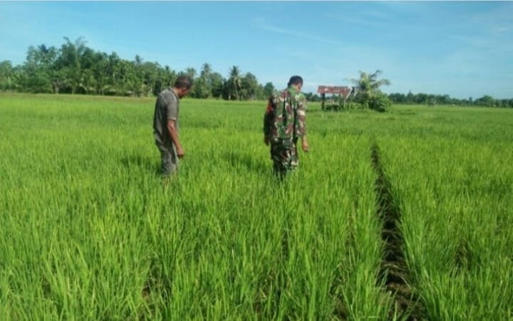 Aceh Barat – Pastikan tanaman Padi tumbuh subur dan terbebas dari serangan hama Keong Mas, Babinsa Koramil 04/Mrb Kodim 0105/Abar Serda Edi Hermanto bersama salah satu Anggota Kelompok Tani (Poktan) melaksanakan sweeping langsung terjun ke tengah – tengah Sawah guna memonitoring perkembangan tanaman Padi yang berlokasi di Desa Peunaga Pasi Kecamatan Meureubo, Senin (7/7/2025)